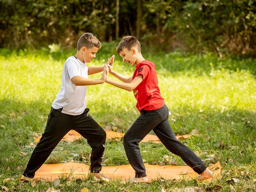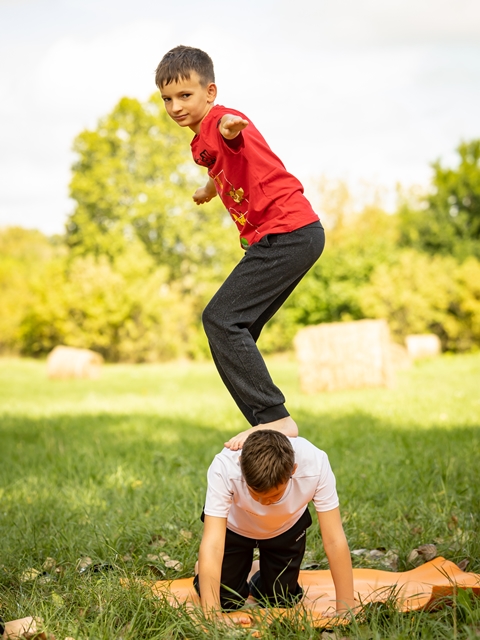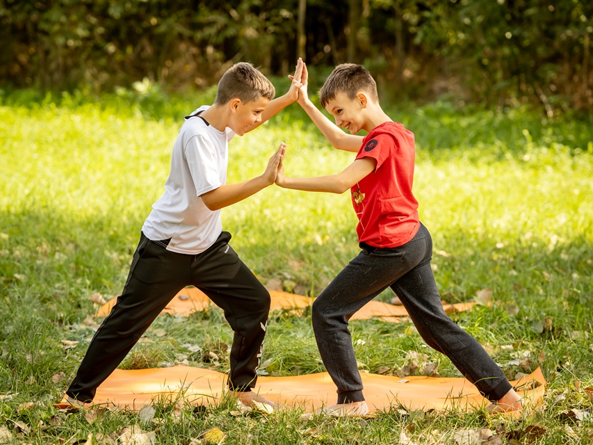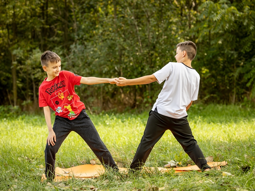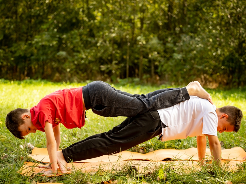 Sok a páros ászana, csoportos gyakorlat, hogy ezalatt is kapcsolódjanak, érezzék meg egymást erejét a srácok.